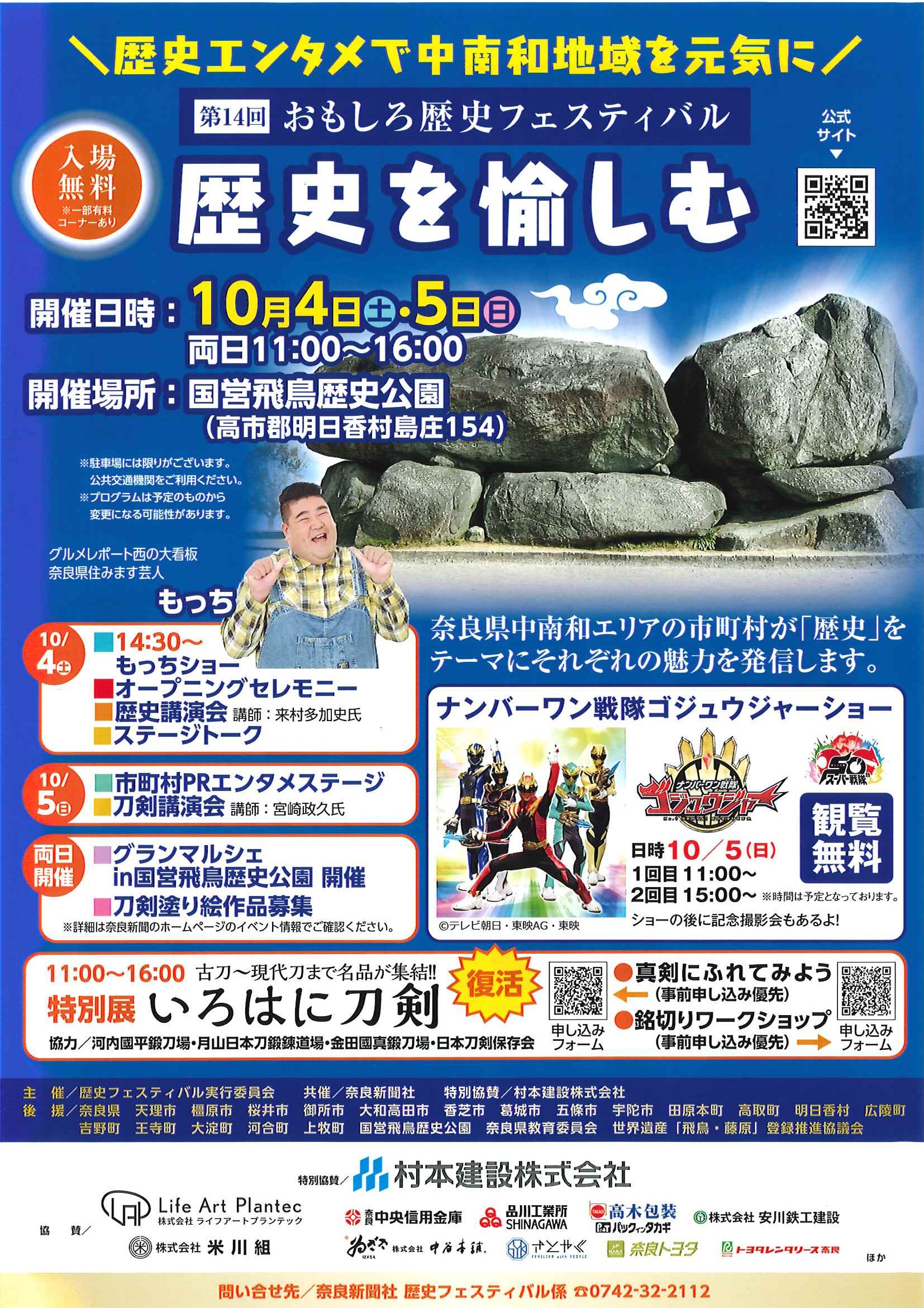 イベント紹介 国営飛鳥歴史公園は、日本の始まりの歴史と原風景が楽しめる場所。 年間を通じて、歴史や体験学習、飛鳥ならではの地域イベントを毎月実施しています。 申込み制となっているものもありますので、イベント案内をよくご覧ください。 月別イベント一覧 2025年11月のイベント 2025年10月のイベント 2025年9月のイベント 2025年8月のイベント 2025年7月のイベント 2025年6月のイベント 2025年5月のイベント 2025年4月のイベント 2025年3月のイベント 2025年2月のイベント 2025年1月のイベント バックナンバー 2024年のイベント 2023年のイベント 2022年のイベント 2021年のイベント 2020年のイベント 0年のイベント イベントで絞り込む 市民イベント企画展特別特別プログラム歴史自然地域文化その他 開催日:2025/10/06(月) 高松塚古墳VR現地解説ツア~VRタブレットで壁画のあった場所を追体験~ 高松塚古墳の現地で専門家がVRタブレット使用して、取り出し前に石室が置かれていた位置、石室内に描かれた壁画、古墳が築かれた当時の様子などを詳しく解説します。VRの技術を使用して古墳の現地で飛鳥時代を追体験してみよう。 その他関連イベント 開催日:2025/10/04(土) 高松塚古墳壁画公開記念 飛鳥の美~ベンガラ染体験~ ※2025/10/4(土)~10(金)開催※ 極彩色壁画の公開記念イベント。ベンガラを使った染物体験。『四神』や飛鳥美人と言われる『西壁女子群像』をモチーフとしたトートバッグ、うちわへの染色体験を行います。 特別プログラム関連イベント 開催日:2025/10/04(土) キトラ古墳周辺地区 10月のイベント(週末体験プログラム) キトラ古墳壁画体験館四神の館では、「勾玉づくり」と「鋳造体験」を楽しめるプログラムをご用意しています。 じゃらんnetで予約受付中! 歴史関連イベント 開催日:2025/10/04(土) 第14回おもしろ歴史フェスティバル「歴史を愉しむ」 奈良県中南和エリアの市町村が「歴史」をテーマにそれぞれの魅力を発信します。 お問合せ 歴史フェスティバル実行委員会(奈良新聞社内 電話0742-32-2112) 歴史関連イベント 12