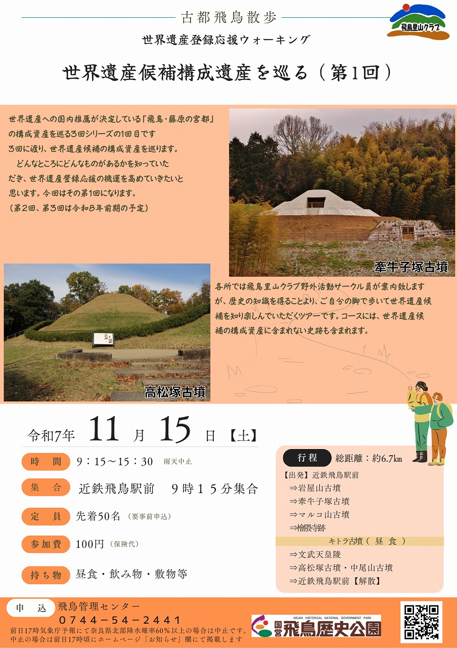 イベント紹介 国営飛鳥歴史公園は、日本の始まりの歴史と原風景が楽しめる場所。 年間を通じて、歴史や体験学習、飛鳥ならではの地域イベントを毎月実施しています。 申込み制となっているものもありますので、イベント案内をよくご覧ください。 月別イベント一覧 2025年11月のイベント 2025年10月のイベント 2025年9月のイベント 2025年8月のイベント 2025年7月のイベント 2025年6月のイベント 2025年5月のイベント 2025年4月のイベント 2025年3月のイベント 2025年2月のイベント 2025年1月のイベント バックナンバー 2024年のイベント 2023年のイベント 2022年のイベント 2021年のイベント 2020年のイベント 0年のイベント イベントで絞り込む 市民イベント企画展特別特別プログラム歴史自然地域文化その他 開催日:2025/11/15(土) 古都飛鳥散歩 世界遺産候補構成遺産を巡る(第1回) 世界遺産への国内推薦が決定している「飛鳥・藤原の宮都」の構成資産を巡る3回シリーズの1回目です。 その他関連イベント 開催日:2025/11/11(火) 古都・飛鳥散歩「万葉歌碑巡り」 明日香村内にある万葉集の和歌が記された石碑を巡ります。和歌や歴史に詳しくなくても大丈夫!公園ボランティアの飛鳥里山クラブ員が解説いたします! 歴史関連イベント 開催日:2025/11/09(日) 古都・飛鳥散歩『野の花めぐりin飛鳥』 秋に咲く花(山野草)の観察を楽しみながら、飛鳥路の自然観察ハイキングを行います。 心のふるさと飛鳥に残る里山。この里山の野道を歩いて道端に根付く野草を観察しながら里山の深まる秋を感じてみませんか。 自然関連イベント