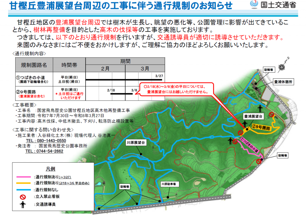 つきましては、令和8年2月18日~3月6日の期間については、甘樫丘展望台(豊浦展望台)及び9号園路の通行規制を行います。※土日祝日は通行いただけます。